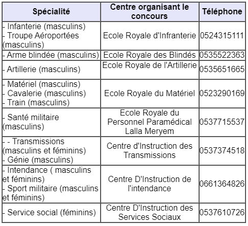 Le concours d’admission au cycle des Elèves Sous-officiers de l’Armée de Terre des Forces Armées Royales sera organisé au titre de l’année 2020, dans les spécialités suivantes :